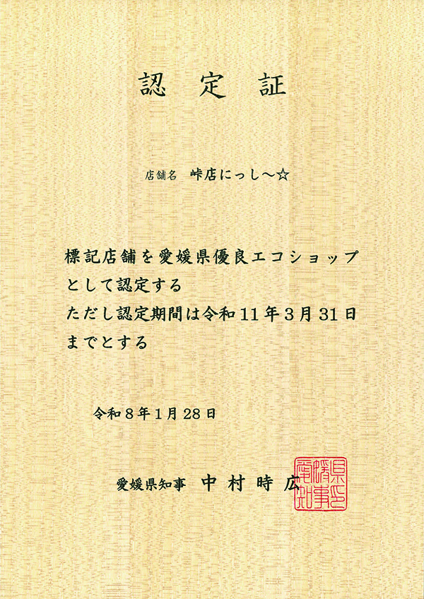 愛媛県優良エコショップ認定制度において、当社直営店の『峠店にっし〜☆』が令和7年度愛媛県優良エコショップに認定されました。